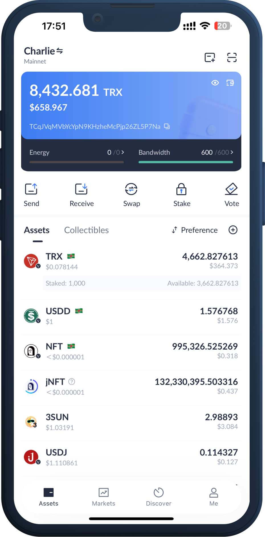 Deep support for the TRON network: we support TRX, TRC-10, TRC-20, and TRC-721 tokens as well as unique staking mechanisms for you to obtain or delegate resources.